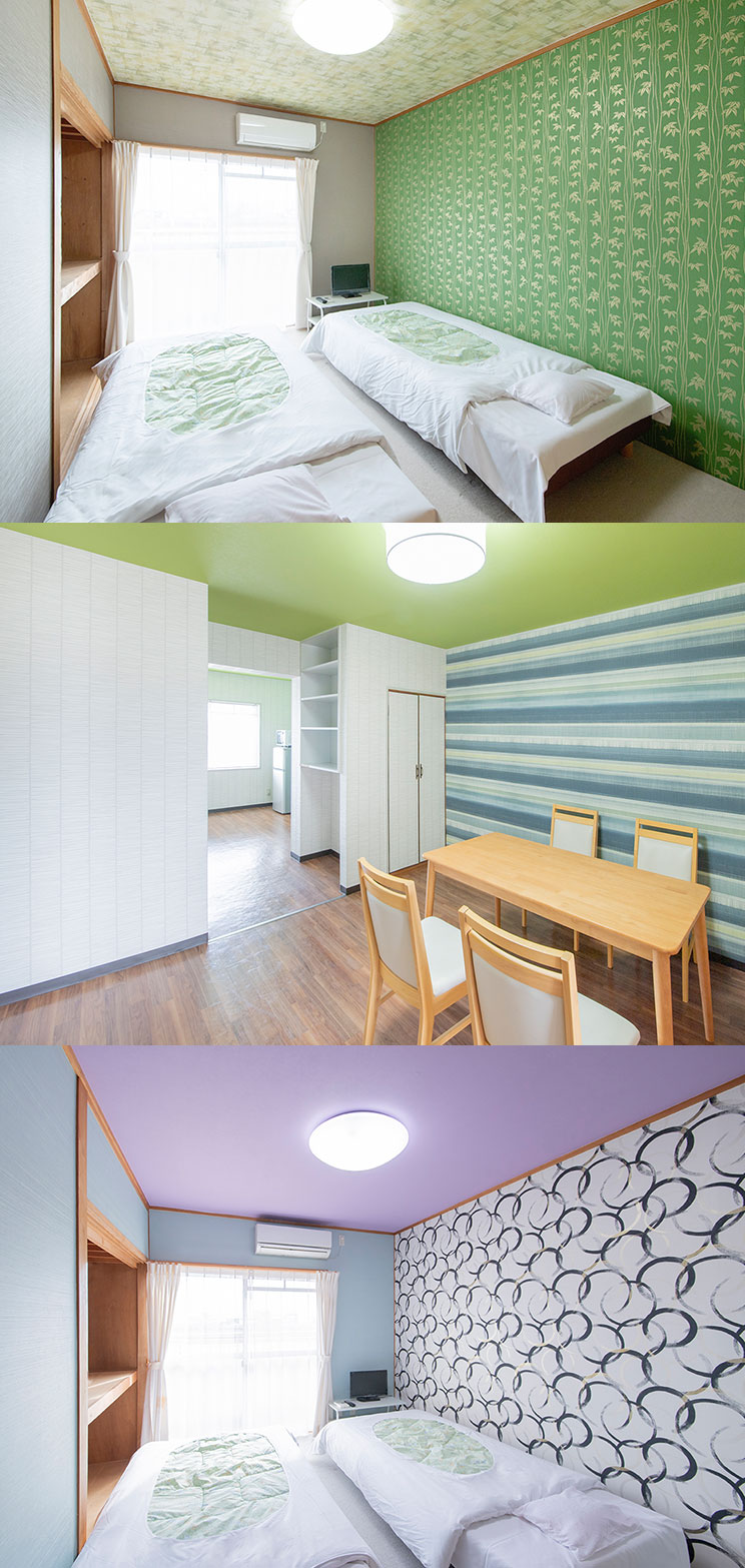 2LDKまたは3LDKのマンションタイプの宿泊棟は、最大6名までのグループでご利用いただけます。専用キッチンには調理器具と食器が一式揃っており、自炊も楽しめます。シェアハウス形式の、”相部屋プラン”でのご利用も可能です!