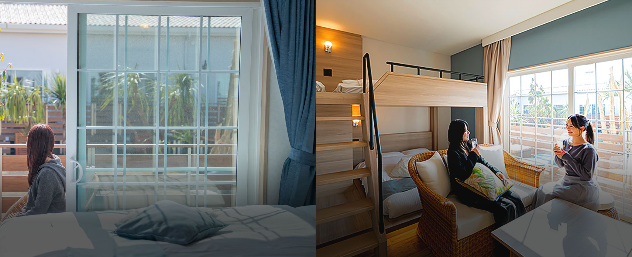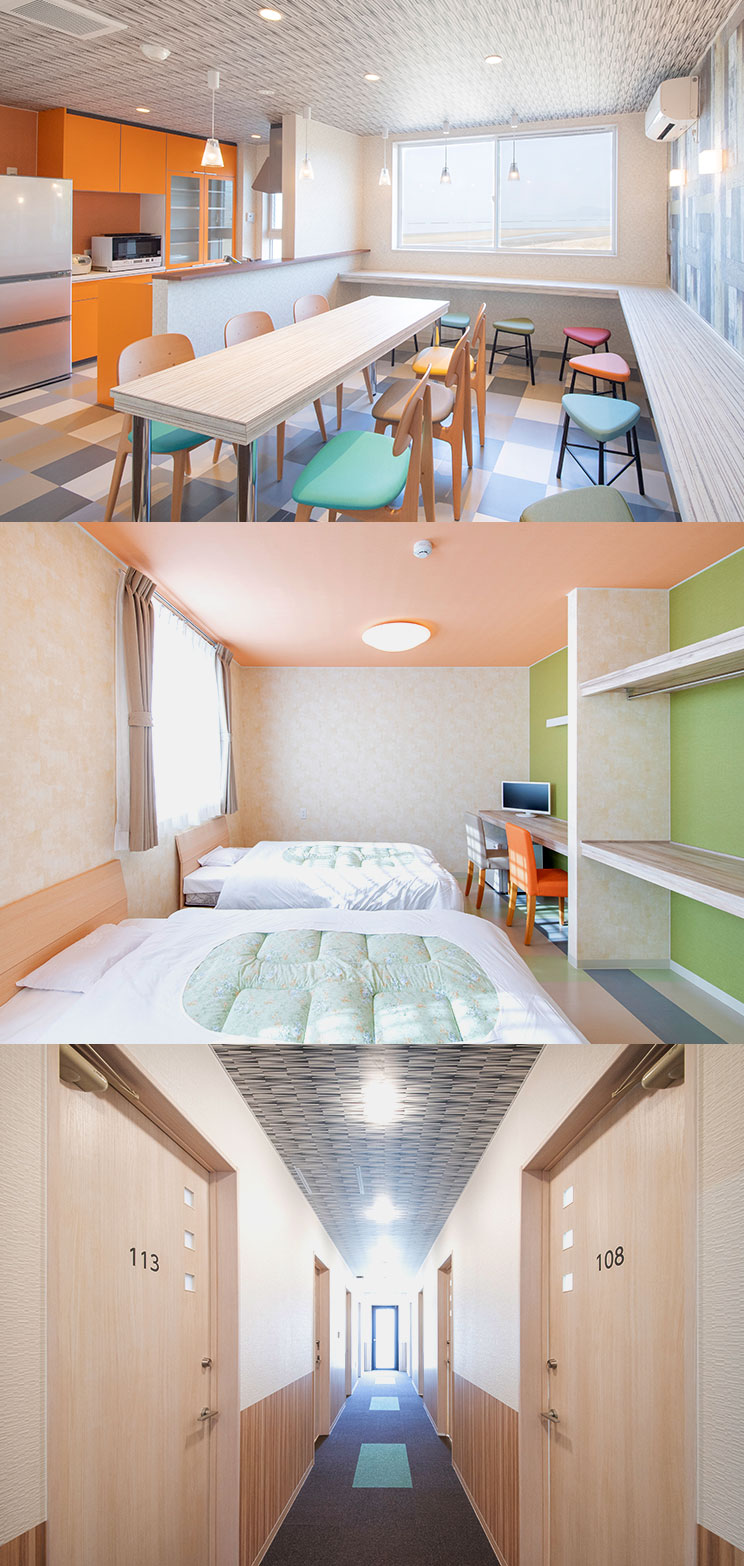 女性専用の宿泊棟で、セキュリティも万全。明るい色合いの共有スペースはオーシャンビューで滞在中は爽やかな気持ちで過ごせます。家具もシンプルで機能的なものが揃い、共同キッチンではお料理も可能です。
