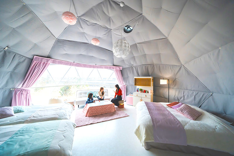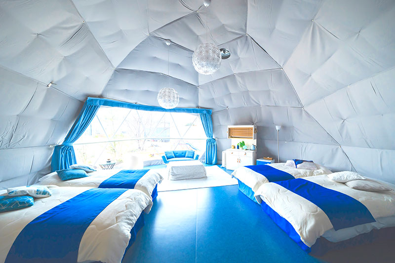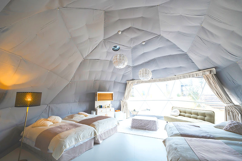 様々なテーマによって内装が特徴づけられた直径7mの大型ドームテントは、非常に広々としています。